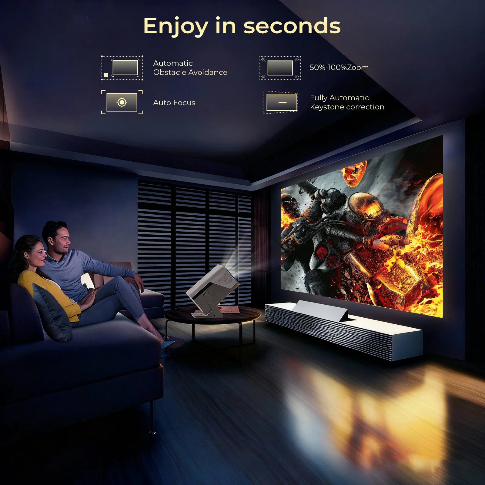Genießen Sie die problemlose Einrichtung mit Autofokus und vollautomatischer Trapezkorrektur (manuelle Anpassung ebenfalls möglich). Intelligente Funktionen wie Bildschirmerkennung und Hindernisvermeidung erhöhen den Bedienkomfort. Flexible Projektionsmodi (vorne/hinten/Decke) passen sich jedem Raum an, mit einer Verzerrung von unter 1 % für ein stabiles Bild.