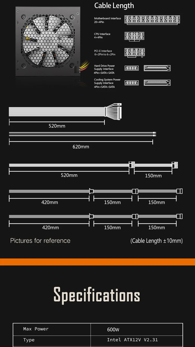 Max600WPowerSupplyPSUPFCSilentFanATX24pin12VPCComputerSATAGamingPCPowerSupplyForIntelAMDComputerRandom