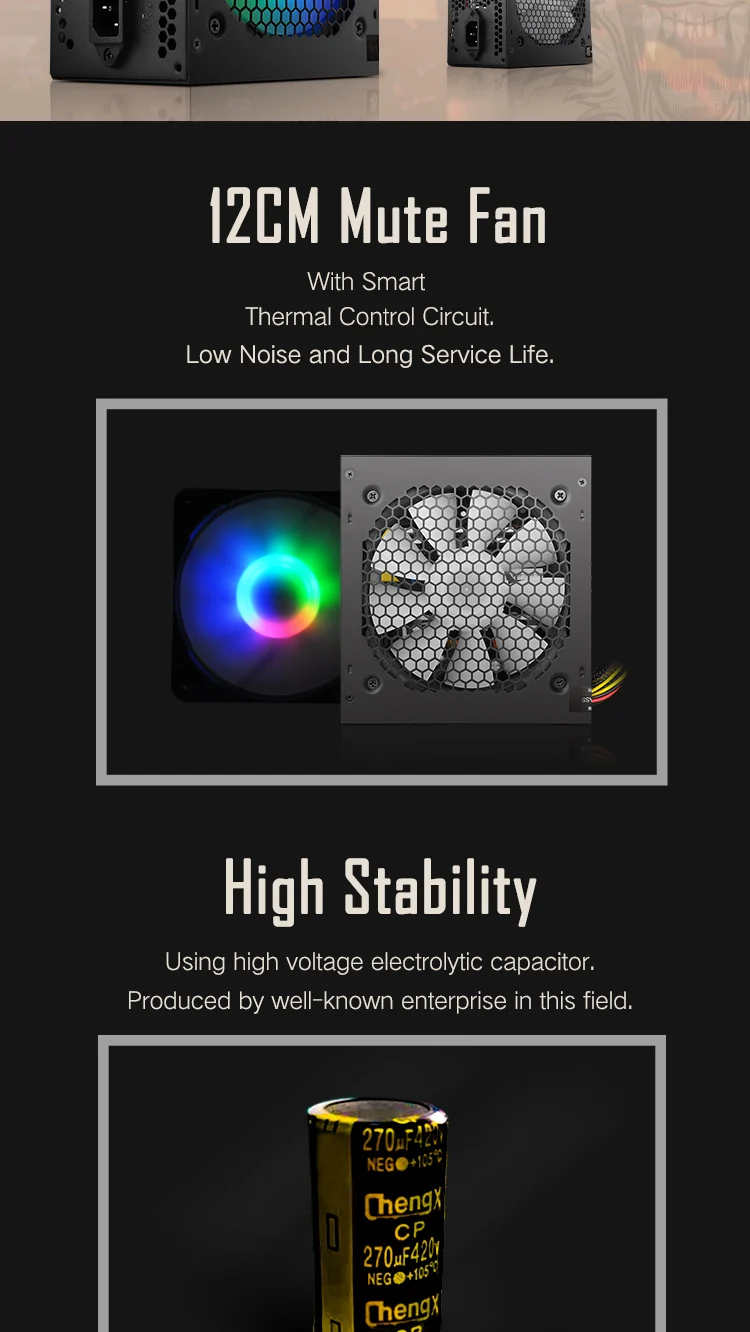 • Ruhiger Betrieb :Ausgestattet mit einem 120-mm-RGB-Lüfter arbeitet dieses Netzteil leise und bietet eine friedliche Spiel-oder Arbeits umgebung.