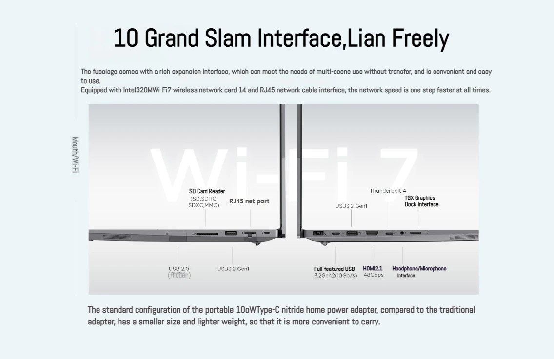 Datenschnittstelle: 1 x Thunderbolt 4; 1 x Vollfunktions-USB3.2 Gen2 (10 Gbit/s); 2 x USB3.2 Gen1; 1 x USB2.0 (versteckt); 1 x HDMI 2.1 TMDS; 1 x RJ45; 1 x SD-Kartenleser (SD/SDHC/SDXC/MMC); 1 x TGX-Grafikkartenerweiterungsdockschnittstelle