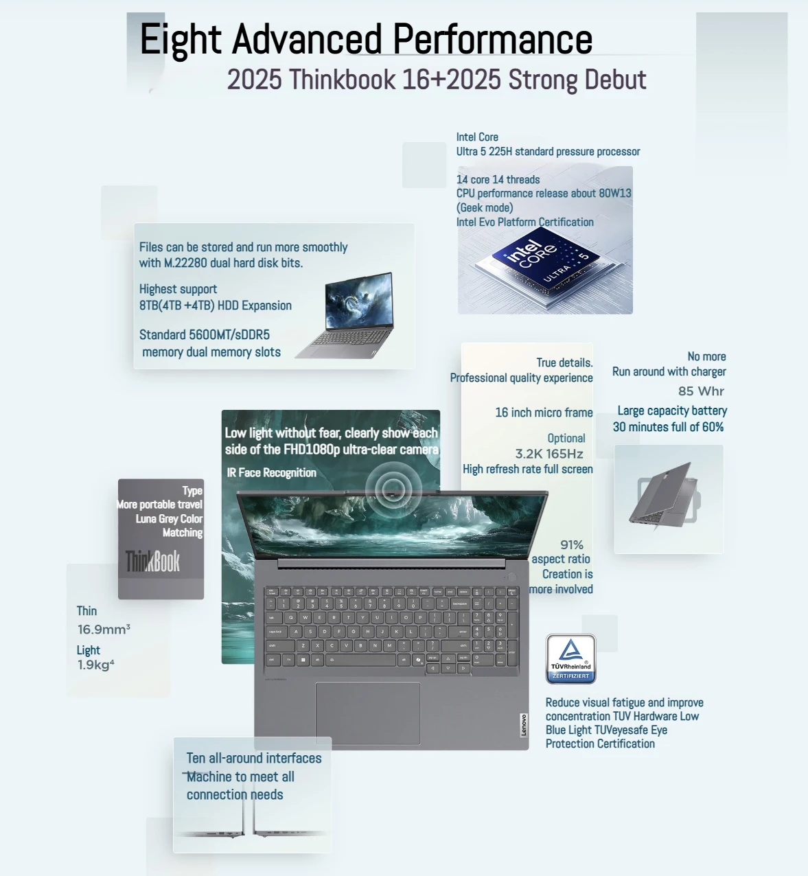 Lenovo Think Book 16+ 2025 Intel EVO-Plattform zertifizierter Core Ultra 9/Ultra 7 Laptop
